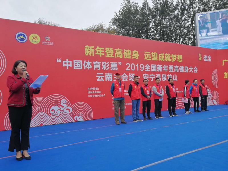 1月1日,“中国体育彩票”2019全国新年登高健身大会云南主会场活动在安宁市龙山隆重举行,2400余名登山爱好者齐聚壮阔俊美的龙山脚下,共同以登高望远的形式迎接新一年的到来。云南省体育局副局长张晓憬出席活动并宣布开幕,云南省体育彩票管理中心主任张云龙、副主任周帅、安宁市副市长倪虹、云南省登山户外运动协会副会长兼秘书长张实,及其他有关领导出席活动。