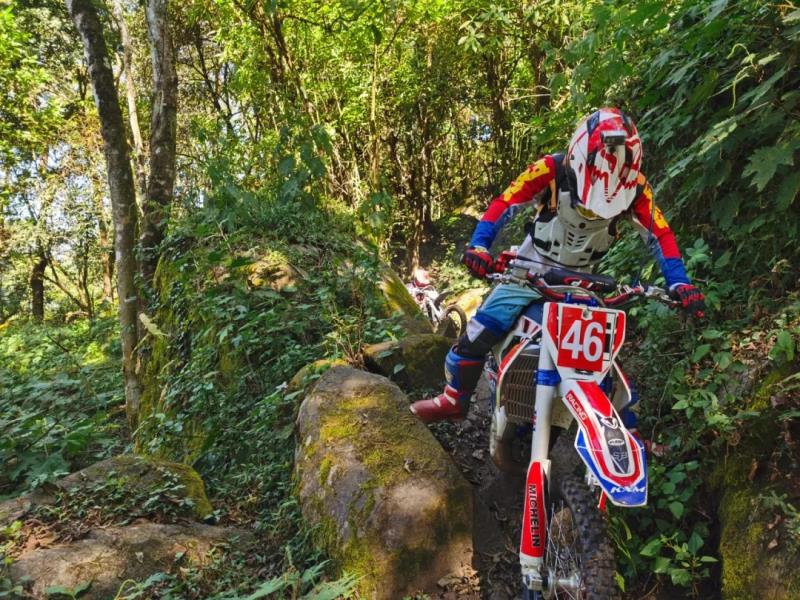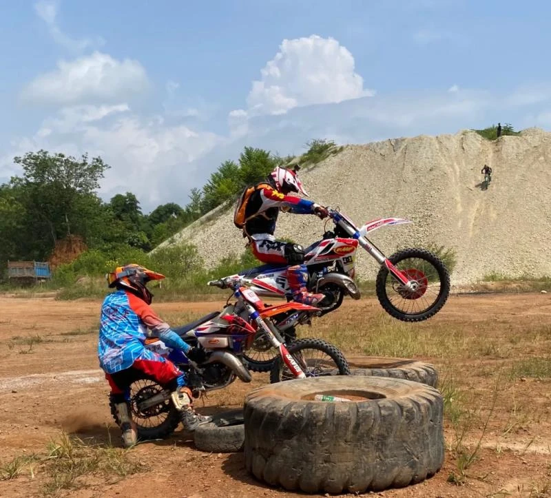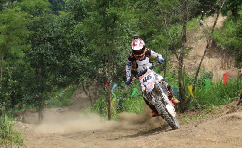 摩托车如战马一般,不断轰鸣着油门,三大与队友展示着他们的骑行技艺。随着一声令下,车手们如离弦之箭,赛道上的沙土被车轮掀起一层尘雾。车手们个个争先恐后,不一会儿就湮没在林地赛道的尽头,只能听到摩托车的轰鸣声。车手们使出浑身解数,分别通过赛道上设置的大平台、驼峰、英雄坡等林间障碍,将摩托越野技巧发挥得淋漓尽致。场面激情四射、高潮迭起,精彩技艺让人目不暇接。附近正在摘茶和路过的村民听到摩托车的轰鸣声,纷纷跑来观看、拍照。现实版“速度与激情”精彩呈现,扣人心弦。