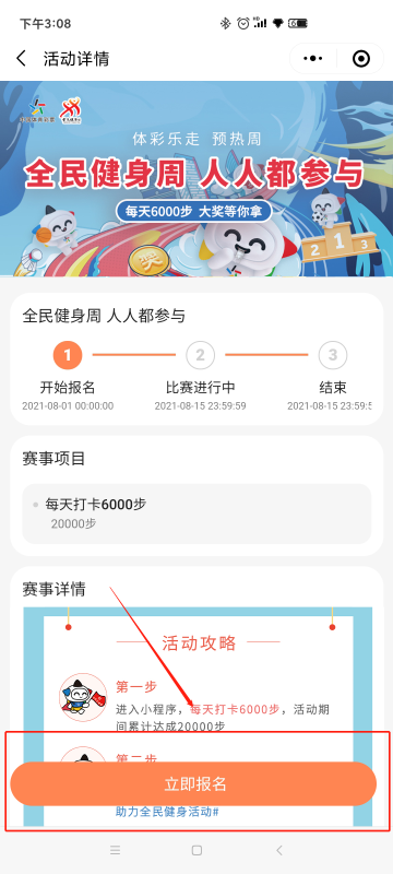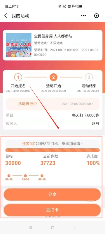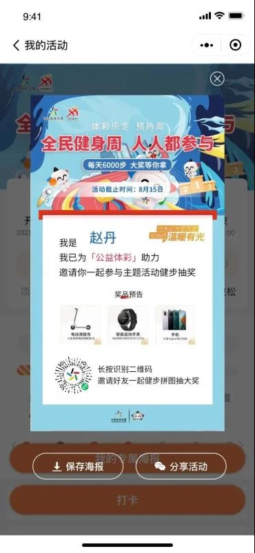 报名成功,进入活动页面,点击分享可生成「个人专属海报」,发送给好友邀请好友一起玩。点击打卡更新步数,达成目标,获得抽奖资格,在8月15日晚20:00,小程序开启抽奖。