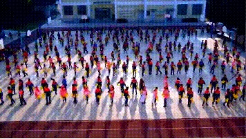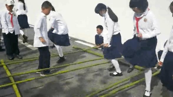 近千名穿着黑色或白色校服的中学生们手持长约70公分的白色棒状物伴着民族音乐在操场上“起舞”,不时用棍子敲敲关节,前后转身、踢腿,动作一气呵成,男女生都跳得非常起劲,配着音乐整个场面妙趣横生。