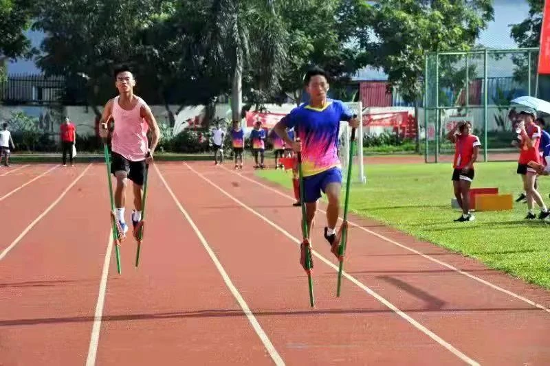 赛场上,脚踩“高脚”和板鞋的运动员一路狂奔