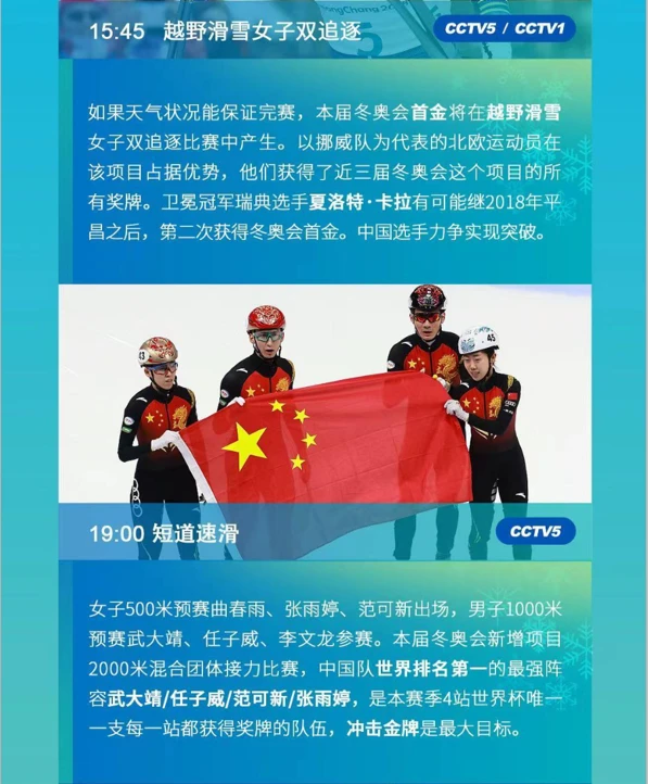 北京冬奥会5日观赛指南:短道速滑2000米混合团体接力中国冲金