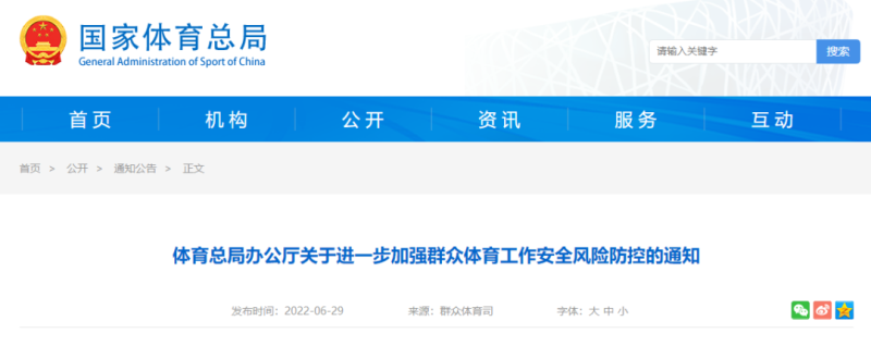 为深入贯彻落实党中央、国务院关于安全生产和新冠肺炎疫情防控常态化工作部署,6月27日,国家体育总局办公厅印发《关于进一步加强群众体育工作安全风险防控的通知》(以下简称《通知》)。
