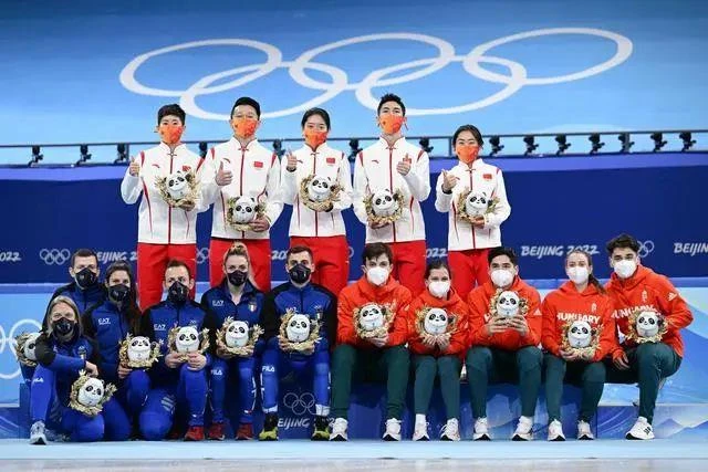 2月5日,短道速滑冠军中国队选手(上)在颁奖仪式上。新华社记者鞠焕宗摄
