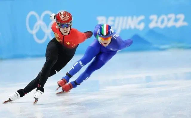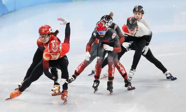 2月5日,中国队选手任子威(左二)与队友曲春雨(左一)在北京2022年冬奥会短道速滑项目混合团体接力四分之一决赛中。新华社记者兰红光摄