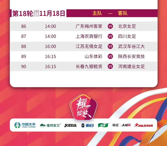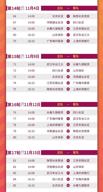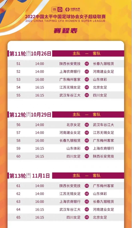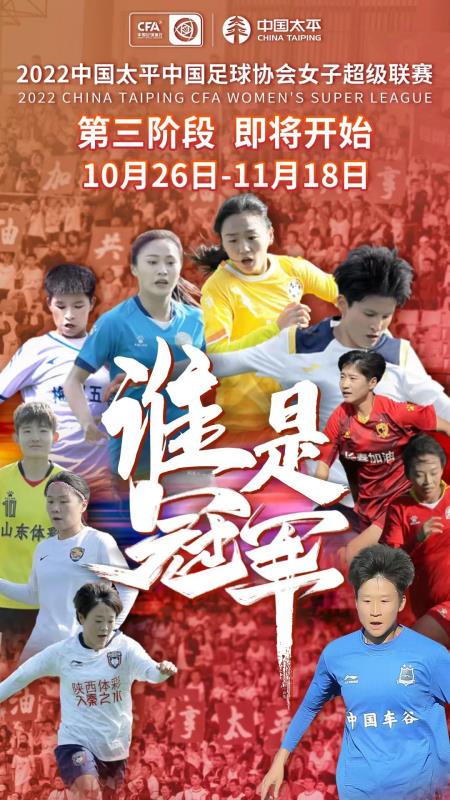 10月26日,经过5个多月的休战期,2022年中国足球协会女子足球超级联赛在昆明海埂体育训练基地重燃战火,正式开始第三阶段、也是最后阶段的比赛,10支女超球队、近500名参赛运动员将在24天的时间里进行8轮40场比赛。首个比赛日,陕西长安竞技VS长春九银租赁、上海农商银行VS河南建业女足、广东梅州客家VS山东体彩、江苏无锡女足VS北京女足、武汉车谷江大VS四川女足展开5场对决。
