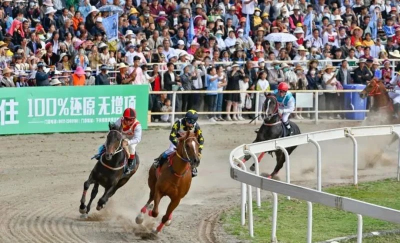 赛马大会开赛仪式后,举行了混合组、民族组2000米速度赛马、混合组1000米走马比赛。闸道内,骑手们紧拉缰绳,一声哨响,马像离了弦的箭般冲出了闸道,马蹄飞舞绝尘而去。比赛惊险刺激,观众席上人山人海,掌声与欢呼声此起彼伏,比赛中各地骑手驾着赛马相互角逐,你追我赶,用娴熟的马上技艺向现场观众展示赛马运动的风采。