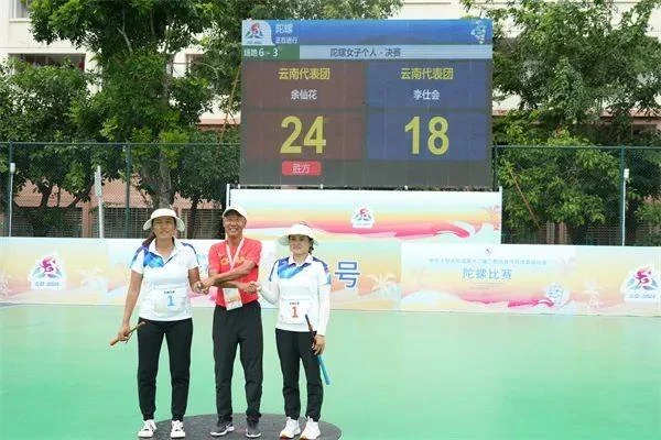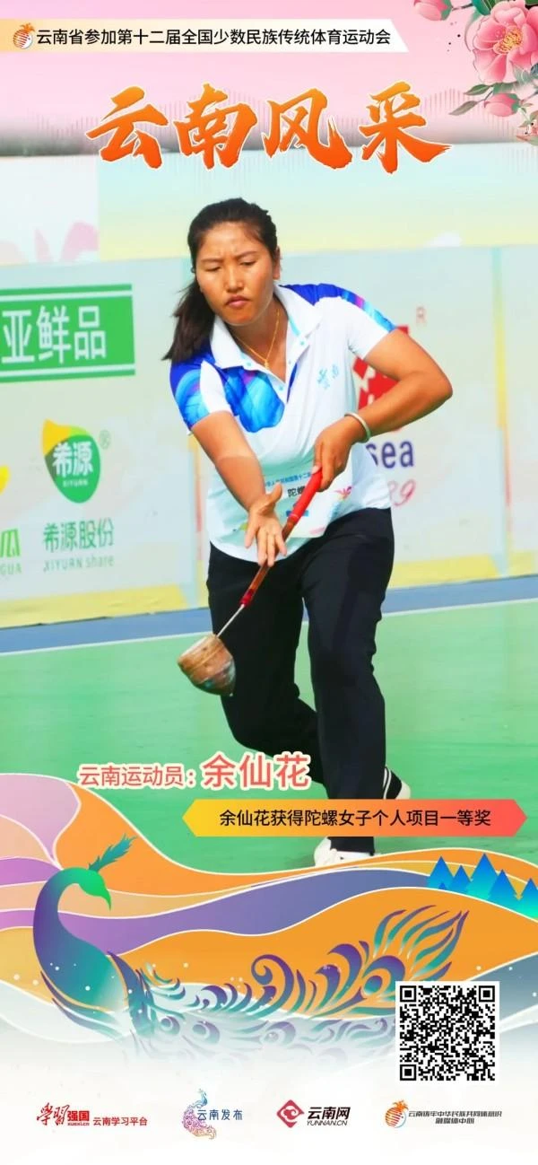 11月25日上午,在第十二届全国少数民族传统体育运动会陀螺女子个人项目的比赛中,云南运动员余仙花、李仕会获得一、二等奖。在决赛中余仙花、李仕会两位运动员同场竞技,最终余仙花6击未失1分,以总分24分的成绩获得一等奖。