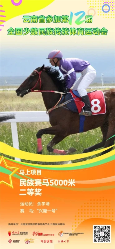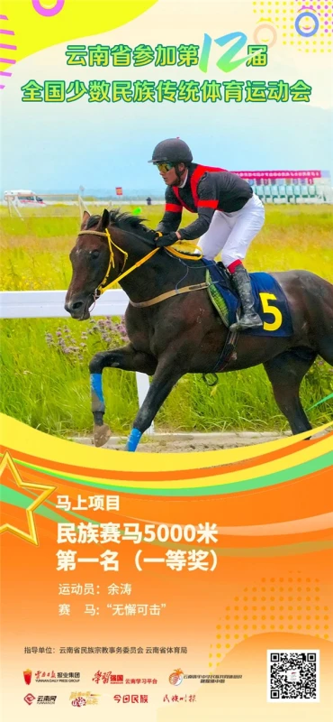 近日,在第十二届全国少数民族传统体育运动会马上项目民族赛马5000米比赛中,云南代表团运动员余涛以6分42秒29的成绩夺得本届运动会云南代表团首个第一名(一等奖),实现了云南在全国少数民族传统体育运动会民族赛马项目上一等奖“零的突破”。此外,云南代表团运动员余学清获得该项目二等奖。