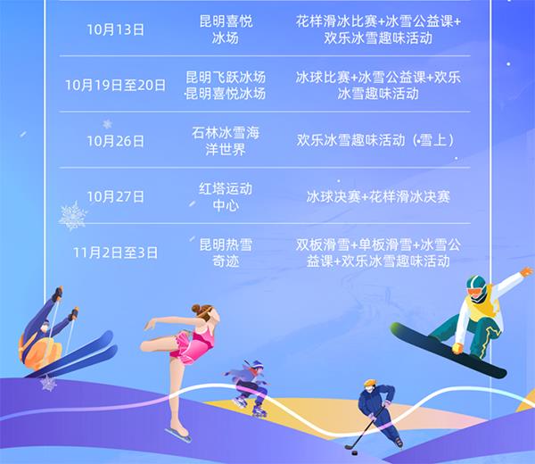 接下来,活动将开启奇妙的冰雪旅程。10月7日至20日期间的周末,活动将陆续在昆明喜悦冰场、昆明飞跃冰场、昆明冰乐享滑冰场举行涵盖冰球和花样滑冰项目的冰上挑战赛,并于10月27日在昆明红塔运动中心进行决赛。此外,活动将于11月2日至3日在昆明热雪奇迹展开雪上项目的角逐,项目分为单板滑雪和双板滑雪。