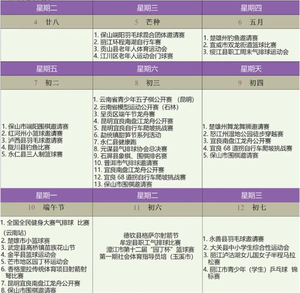 “七彩云南”全民健身赛事活动主要是以向各界宣传推荐具有地域特点、主题活动、云南特色的各类赛事活动,让群众有机会去了解身边的体育赛事并参与其中,也借助云南特色体育赛事活动向全国各地乃至世界各地人们认识、了解、喜欢云南。2024年6月主题活动围绕“七彩云南”全民健身赛事活动、“彩云之南”棋牌系列活动、三大球、云南省社区活动、以及中小学生运动会时序开展。