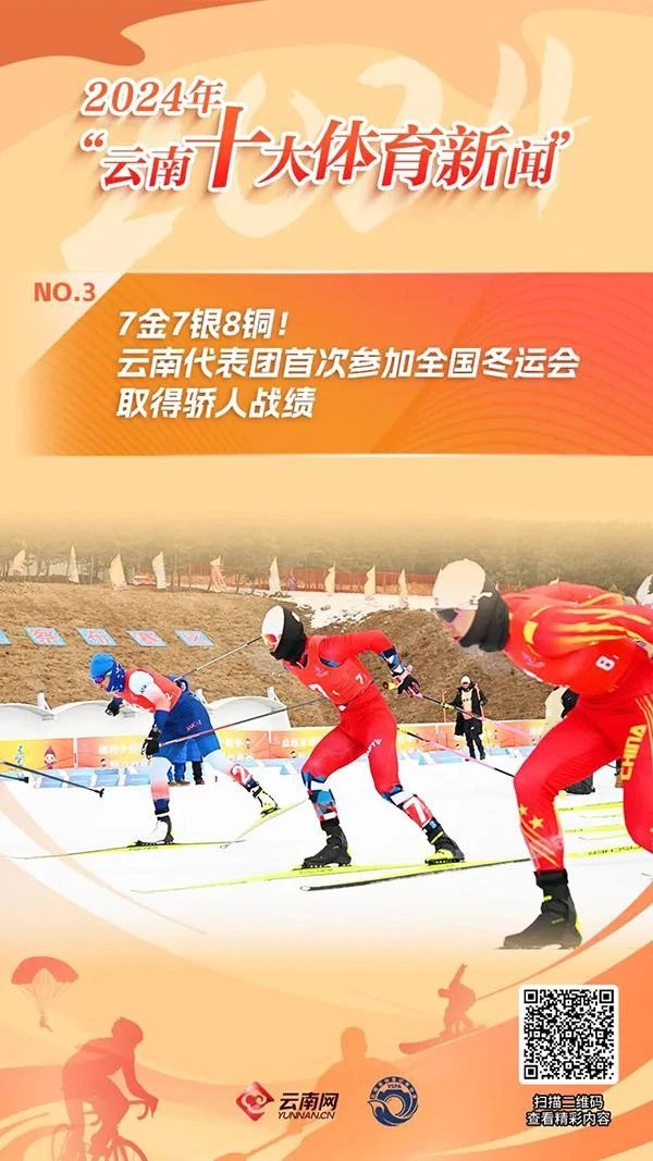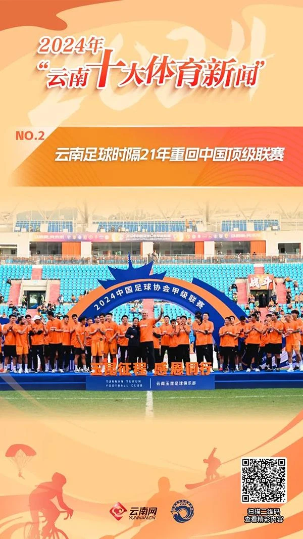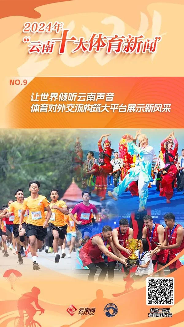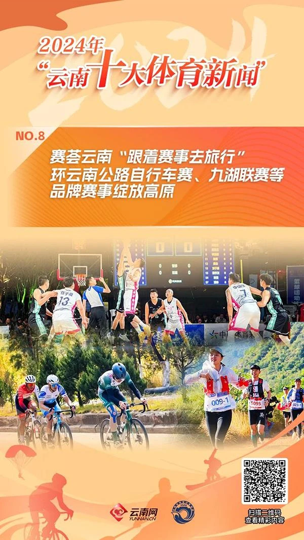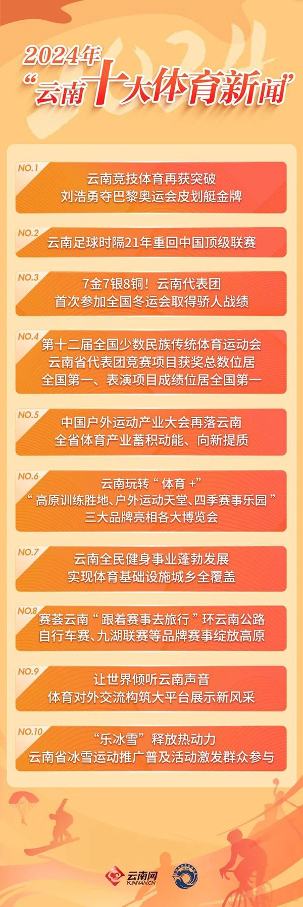 2024年云南体育在机遇中奋起,在改革中前行,在体育强国建设实践中进一步凝聚合力、积累经验、厚植基础,全省体育系统同心协力、拼搏进取,推动体育事业发展取得了新成就,进一步擦亮了“高原训练胜地、四季赛事乐园、户外运动天堂”三大品牌。2024年“云南十大体育新闻”全面展现了云南在竞技体育、群众体育、体育产业、青少年体育、对外交流等领域取得的丰硕成果,下面通过一组海报回顾。