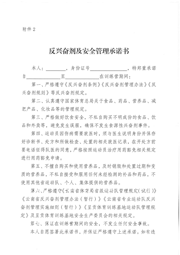 (二)训练营学员于12月14日20:00前,携承诺书(附件2)自行到呈贡体育训练基地报到,联系人:钱顺敏 13577093206;12月25日12:00前离会;