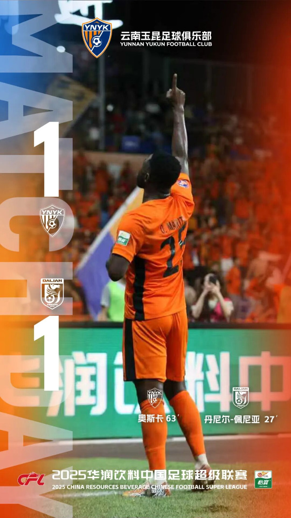 本场比赛,两队攻防节奏紧凑,大连英博凭借上半场佩尼亚的补射率先破门,云南玉昆则在下半场依靠奥斯卡的头球扳平比分,最终双方1:1握手言和,各取一分。