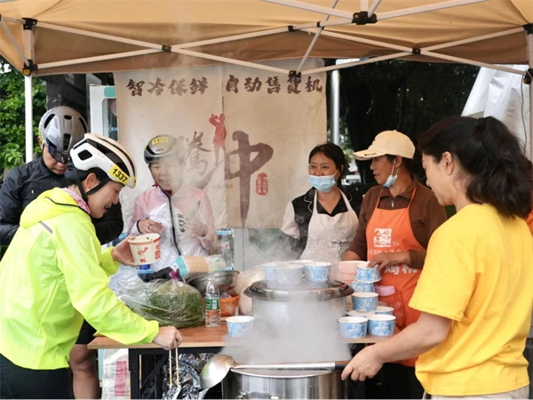 今年,腾冲站将节赛体验再次优化提升,不仅设置了“保山腾冲非物质文化遗产长廊”,展演腾越剪纸、皮影戏等非物质文化遗产,以及佤族歌舞快闪、民族服装旅拍等体验项目。考虑到天气突变原因,组委会早在开赛前一晚就做足了预案,不仅在赛事进程中及时结束了比赛,而且在赛事终点紧急设置多个热食点,免费提供土锅子、腾冲饵丝、大救驾、稀饭、姜汤等当地美食及热食,让选手们不仅体验了“舌尖上的腾冲”,更获得了冷雨中的一份难得的温暖。“腾冲的赛道真是又美又难,加上下雨,让今天的挑战难度急剧攀升,我也及时调整了自己的节奏,以免影响接下来的赛事。赛事的组织很完善,能够给我们提供及时的后勤保障,让我在雨中也能很安心地骑行,这趟骑行既有挑战又有温度。”刚到终点的选手沈国胜边喝着姜汤边描述着参赛感受。