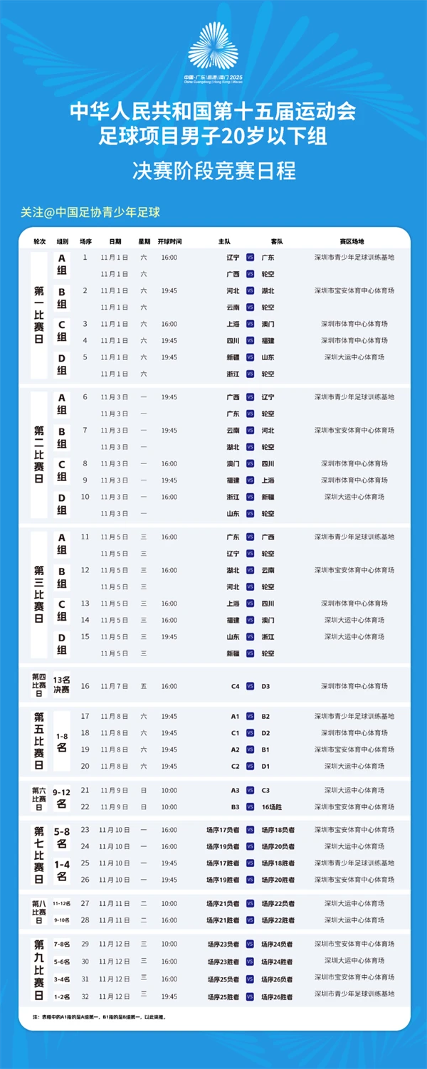 第十五届全国运动会U20男足决赛阶段比赛于11月1日开幕,13支参赛队伍分为4组进行3轮单循环赛,各小组第一名和第二名进入1至8名交叉赛并决出最终排名。云南队落位B组,在深圳市宝安体育中心体育场与湖北队、河北队展开较量。