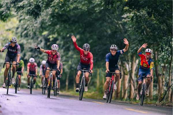 清晨8时,泼水广场汽笛长鸣,长距离组选手率先冲出起点,选手们的灵动身影与雨林晨雾交相辉映。他们穿行于秘境雨林、连绵胶林与芬芳果林之间,在竞技角逐中饱览雨林葱郁生机,感受傣家竹楼古朴韵味,深度体验“运动融入自然”的独特魅力。短距离组赛道同样好景不断,选手沿澜沧江畔骑行,途经傣族竹楼群时,群众的象脚鼓助威声此起彼伏。