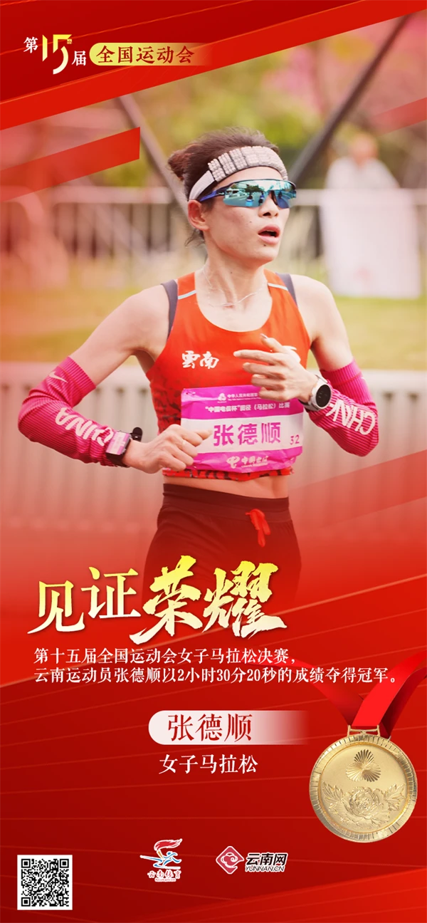 11月15日,在第十五届全国运动会女子马拉松决赛中,云南运动员张德顺凭借出色的节奏控制和后半程的强大冲刺能力,以2小时30分20秒的成绩夺得冠军,为云南省体育代表团摘下本届全运会的第3块金牌。她也凭此成为全运会历史上首位连续两届获得马拉松冠军的运动员。