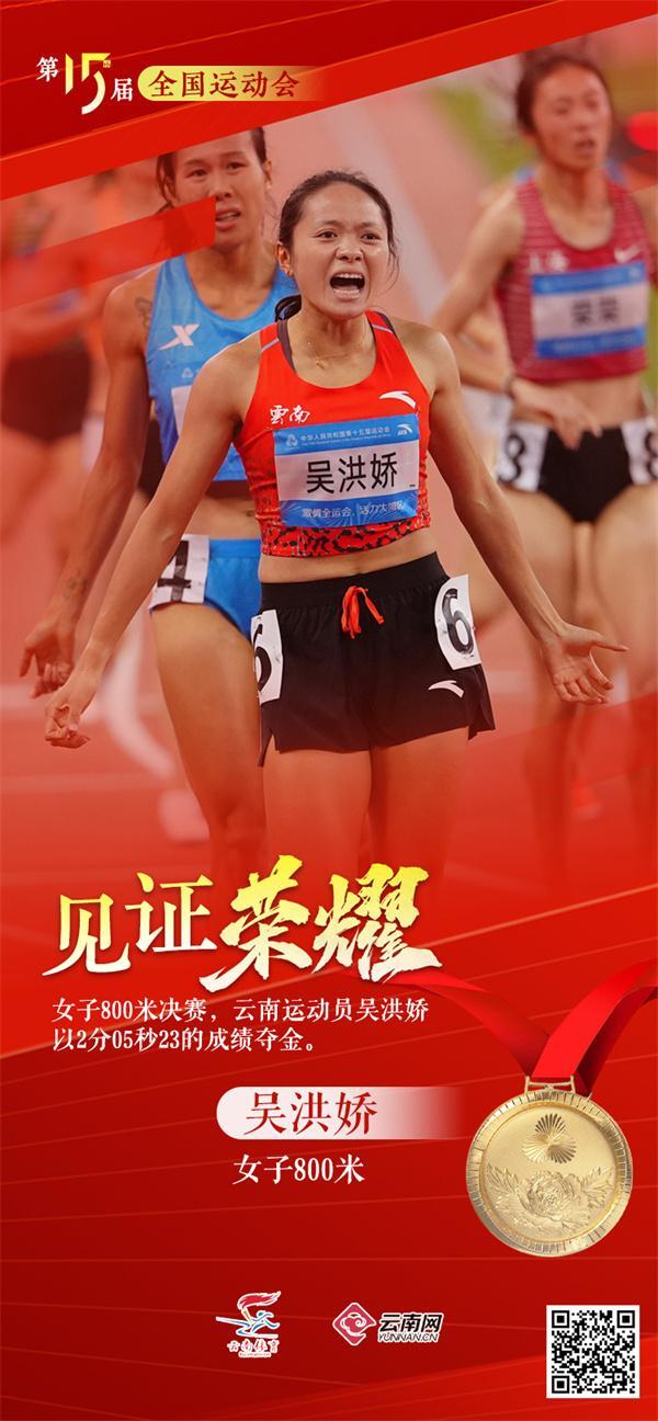 在广东奥体中心体育场举行的第十五届全国运动会田径女子800米决赛中,云南选手吴洪娇以2分05秒23的成绩第一个冲过终点线,为云南省体育代表团摘下本届全运会第4枚金牌。