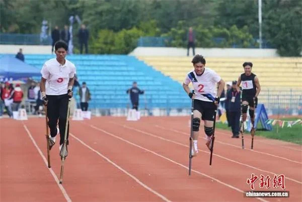 11月18日,高脚运动员进行100米竞速赛。黄兴鸿 摄