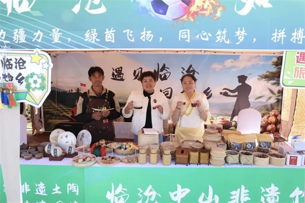 揭幕战当天的“玉见”主题集市更是热闹非凡。来自临沧的商铺摊位前人头攒动,负责人普凤丽正忙着给游客介绍桌上的展品。包装精致的团茶、纹路细腻的竹编、色泽温润的土陶整齐陈列,空气中还飘着咖啡与茶叶的香气。“我们是专门从临沧赶来滇超联赛摆摊的,就是想把家乡的好物都分享给大家。”普凤丽拿起一块竹编摆件介绍道,“这些不仅是临沧的特产,像团茶、竹编、土陶都是省级非遗,希望通过赛事让更多人认识它们。”谈及来此摆摊的收获,她满脸笑意:“好处太多了,既能把临沧的咖啡、坚果、茶叶推出去,还能与普洱、保山的商家交流取经,互相学习冲泡技巧和经营思路。也欢迎大家都去临沧走走,感受‘遇见临沧,如回故乡’的温暖。”