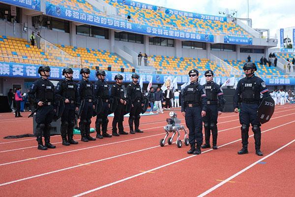 本场赛事的科技元素更是令人兴奋,五华警方派出的警用机器狗成为赛场外“安全卫士”,只见它们约半米高的身形裹着银灰色金属“铠甲”,胸前印着清晰警徽,搭载抓捕网可精准控制可疑人员,还配备喊话器实时传递警方提示。“机器警察”们在人流中巡逻,稳健的机械步引来不少观众驻足拍照,筑牢安全防线的同时也成为滇超联赛的一道独特风景。