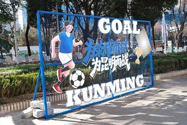 为凸显滇超专属氛围,场馆打造了系列主题设施:体育场外围墙绘融合滇池海鸥、云南陆军讲武堂等城市地标与“为荣耀而拼 为昆明而战”赛事标语,成为市民打卡热点;绿化带里的足球造型花球、路口创意涂绘的足球石墩,以及城市主干道上的赛事道旗,从街头到场馆全方位营造热烈氛围。