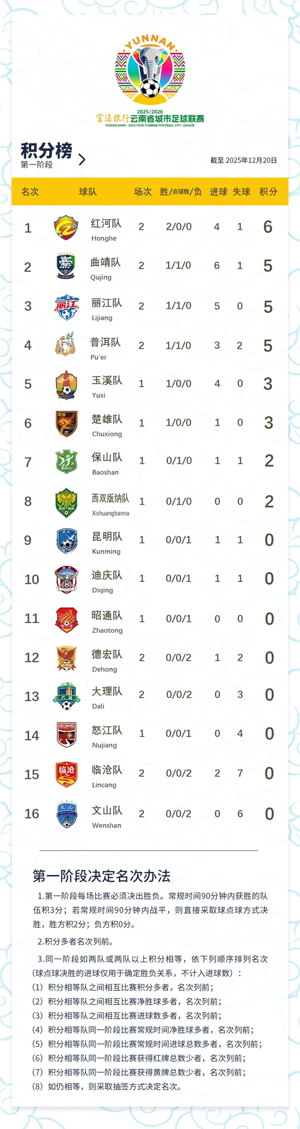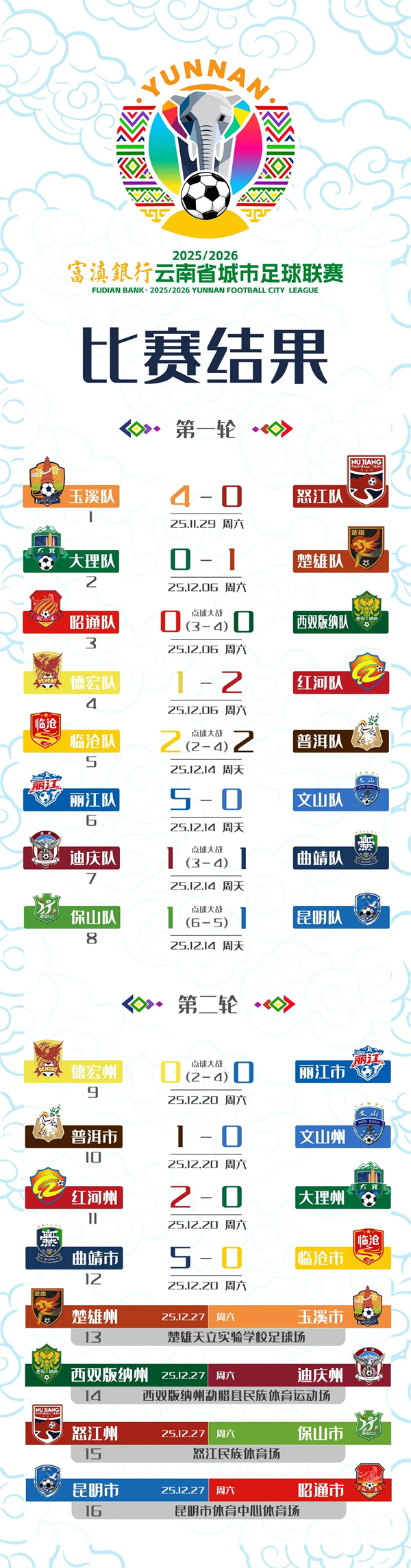 德宏0-0丽江(点球2-4)。此役,首轮5球大胜登顶积分榜的丽江队客场挑战德宏队。德宏队首战惜败红河队后急于抢分,此役坐镇主场众志成城,凭借顽强防守与积极拼抢,在90分钟常规时间内成功限制住丽江队的攻势,双方0-0握手言和,比赛进入点球大战。点球对决中,丽江队展现出强队沉稳底蕴,凭借较高的点球命中率最终以4-2的比分击败德宏队。尽管常规时间未能破局,丽江队仍艰难在客场斩获2分。