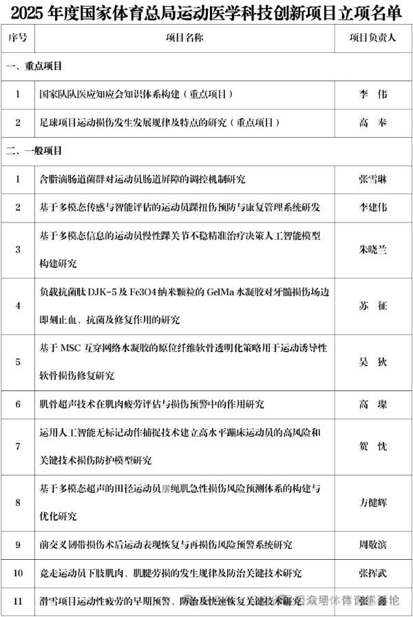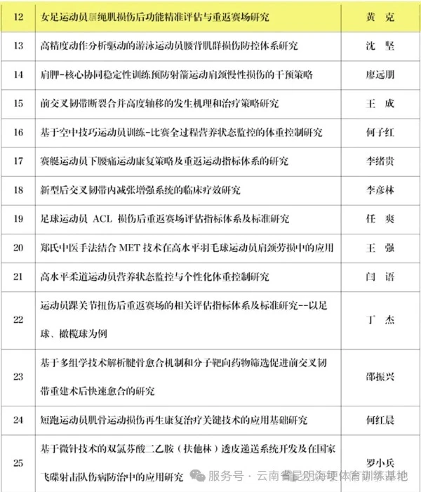 日前,国家体育总局科教司公示了2025年度国家体育总局运动医学科技创新项目立项名单。本次共有27个项目拟立项,其中云南省昆明海埂体育训练基地(中心)有1个项目入选《项目名称:女足运动员腘绳肌损伤后功能精准评估与重返赛场研究》,由运动表现与健康服务中心具体牵头实施。