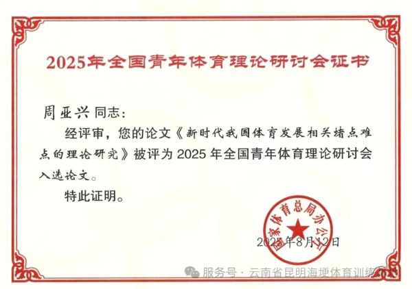 此外,近期国家体育总局开展了“2025年全国青年体育理论研讨会”,海埂基地运动表现与健康服务中心周亚兴同志参加该研讨会第五项—“体育理论”专题,并以“新时代我国体育发展相关堵点难点的理论研究”为题作论文入选。