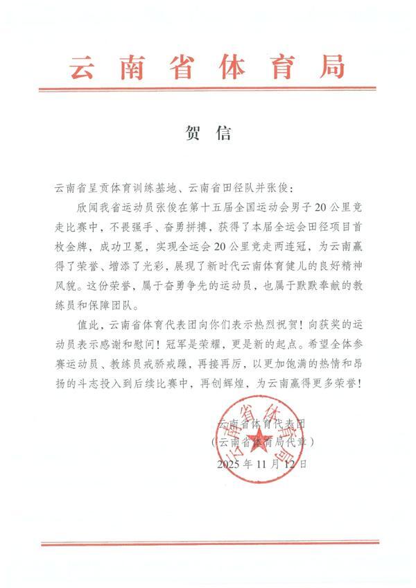 欣闻我省运动员张俊在第十五届全国运动会男子20公里竞走比赛中,不畏强手、奋勇拼搏,获得了本届全运会田径项目首枚金牌,成功卫冕,实现全运会20公里竞走两连冠,为云南赢得了荣誉、增添了光彩,展现了新时代云南体育健儿的良好精神风貌。这份荣誉,属于奋勇争先的运动员,也属于默默奉献的教练员和保障团队。