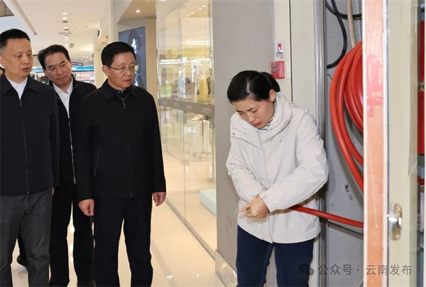 王予波在玉溪万达广场,检查消防设备是否正常运行。