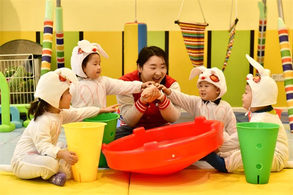 2025年2月20日,在山东省日照市东港区知子树托幼园,老师陪伴孩子做游戏。记者 郭绪雷 摄