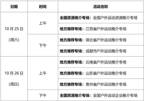 此外江苏、湖北、山东、贵州、成都几个省(市)也将分别做户外运动地方专场推介,充分展现“户外+”与“+户外”的无限潜力,通过重点项目签约与资源对接,共同推动户外运动从单一的体育活动,向构建高质量产业链与生态圈的战略目标迈进,为区域经济与全民户外运动注入强劲活力。