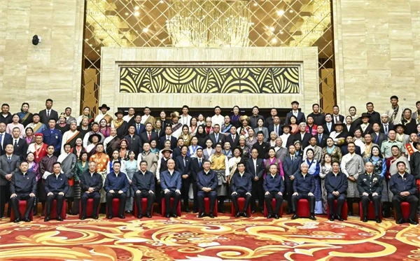 8月20日下午,中共中央总书记、国家主席、中央军委主席习近平在拉萨亲切接见西藏各族各界代表,并同大家合影留念。新华社记者 燕雁 摄