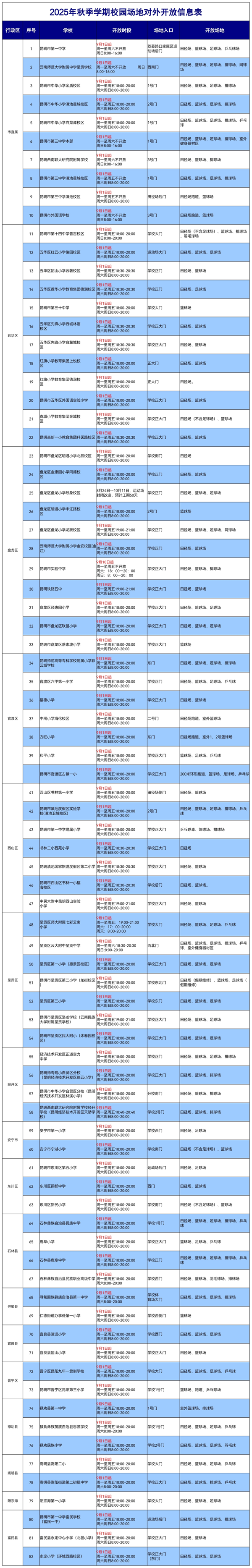 秋季来临,昆明市校园体育场地开放服务持续升级!继暑期82所学校体育场地免费开放带动全民健身热潮后。9月1日起,昆明市将继续向市民朋友敞开校园运动空间大门。