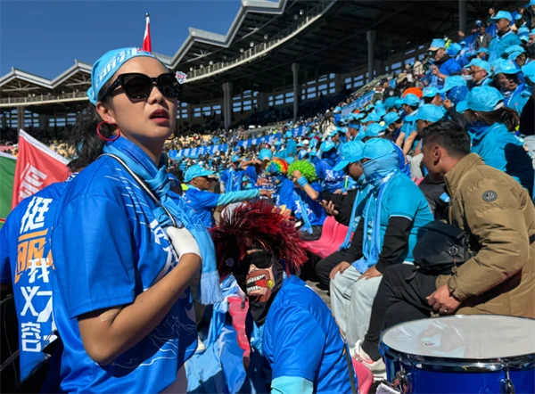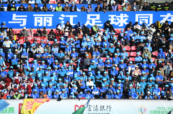 12月14日下午,2025/2026富滇银行云南省城市足球联赛丽江主场首战开幕。在激昂战鼓声中,千余名身穿统一蓝色球衣的球迷在看台上齐声高喊:“丽江,加油!纳若,敢啸!”将丽江市体育发展中心化为一片蓝色海洋。