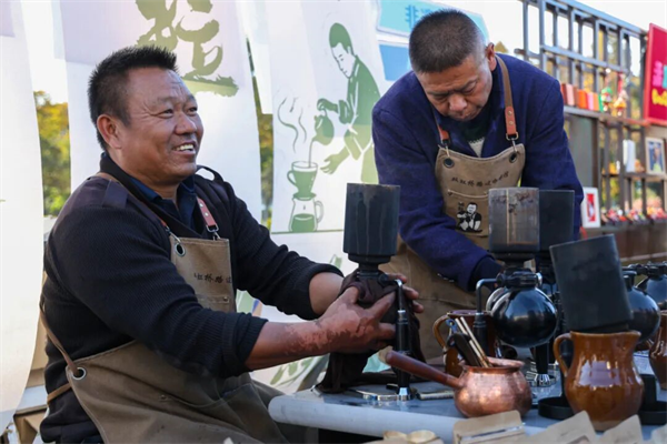 12月14日的保山体育场外,早早便热闹起来。沿着体育场外围,甲马雕刻、永昌纸扎、永昌棋子等非遗文创摊位一字排开,烟火气与文化味交织在一起,构成了独特的赛前风景线。双虹桥路边咖啡馆的老板李金合,人称“咖叔”,正忙着给排队的球迷冲煮咖啡,他的摊位围满了驻足看他制作咖啡的人,“以前在店里煮咖啡,来的多是本地人,这次借着滇超的东风,好多昆明来的球迷特意找过来。”“咖叔”一边操作手中的咖啡煮具一边说,摊位前围满的人让他无暇回答更多问题了。