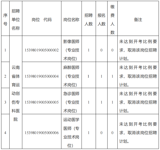 2026年上半年云南省体育局直属事业单位公开招聘人员报名工作已结束,因4个岗位报考人数达不到开考要求,按照《2026年上半年云南省体育局直属事业单位公开招聘人员公告》,现将招聘计划裁减情况公布如下: