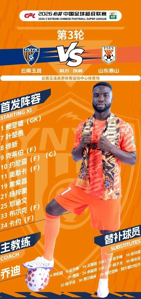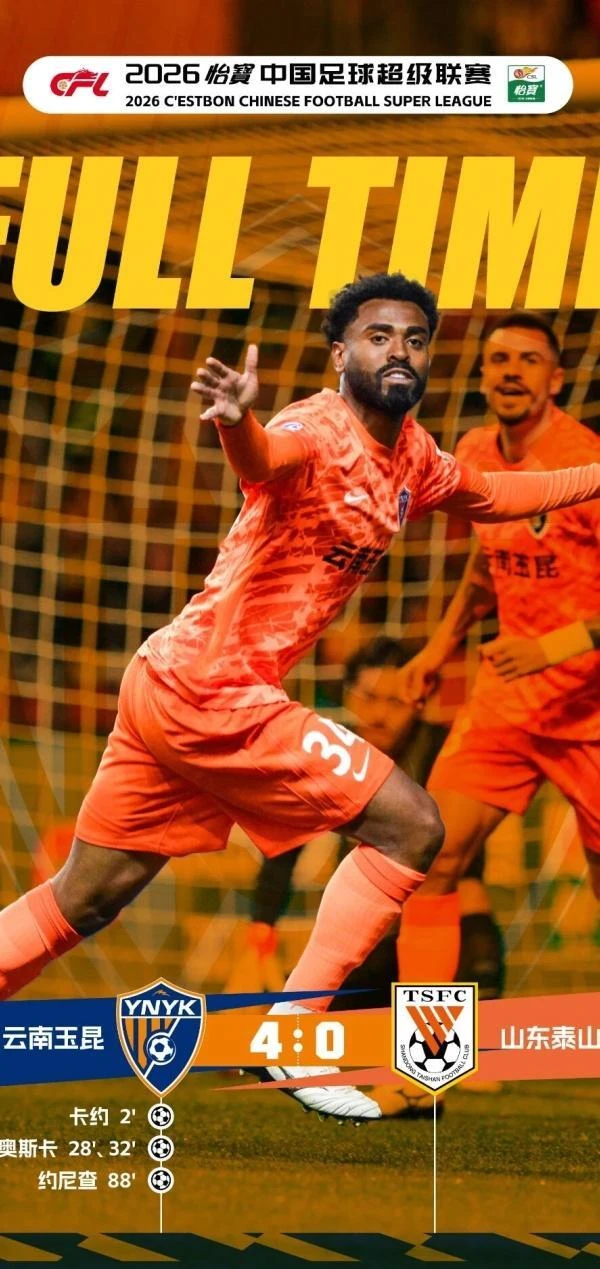 3月21日20:00,中国足球超级联赛第三轮焦点战打响,云南玉昆坐镇玉溪高原体育运动中心体育场,迎战劲旅山东泰山。前两轮赛事中,云南玉昆取得一胜一负的战绩,球队在磨合中逐步寻找节奏,山东泰山则以两连胜完成负分清零,士气正盛,一场备受瞩目的攻防对决就此展开。最终,云南玉昆以4-0大胜山东泰山,继续在中超顶级联赛赛场保持对山东泰山的不败战绩。