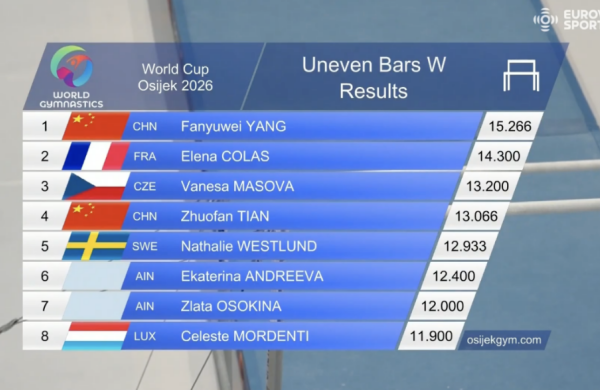 4月12日,在2026体操世界杯奥西耶克站高低杠决赛中,云南体操运动员杨凡予微以15.266的高分夺冠,并创下个人国际比赛高低杠项目得分新高!
