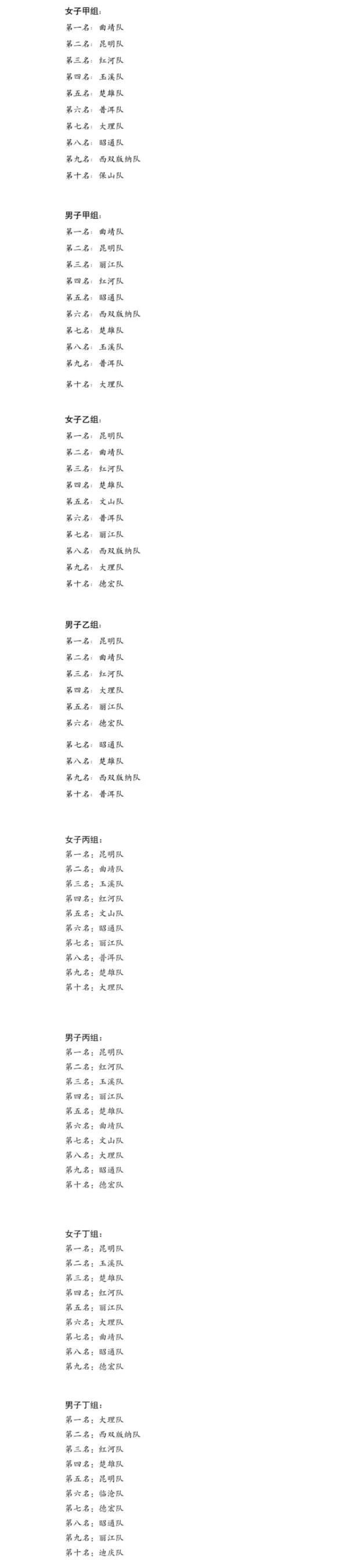 丁组的比赛在红河哈尼族彝族自治州开远市足球训练基地举行。其中女子组共9支参赛队伍,进行冠军争夺的是昆明队与玉溪队,最终昆明队夺得组别冠军;男子组共12支参赛队伍,大理队与西双版纳队以黑马之姿会师决赛,最终大理队获胜。
