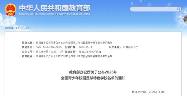 近日,教育部办公厅发布《关于公布2025年全国青少年校园足球特色学校名单的通知》。经有关学校自主申报、专家评审、省级教育行政部门审核推荐、社会公示等程序,教育部认定并命名全国青少年校园足球特色学校4928所。
