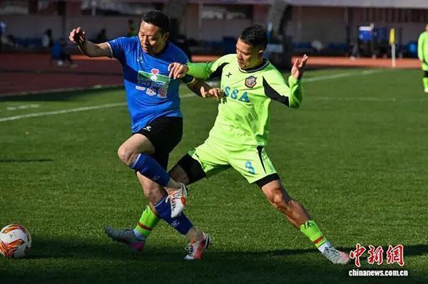 图为香港明星足球队(绿衣)与昆明明星足球队在比赛中抢球。中新社记者 李嘉娴 摄