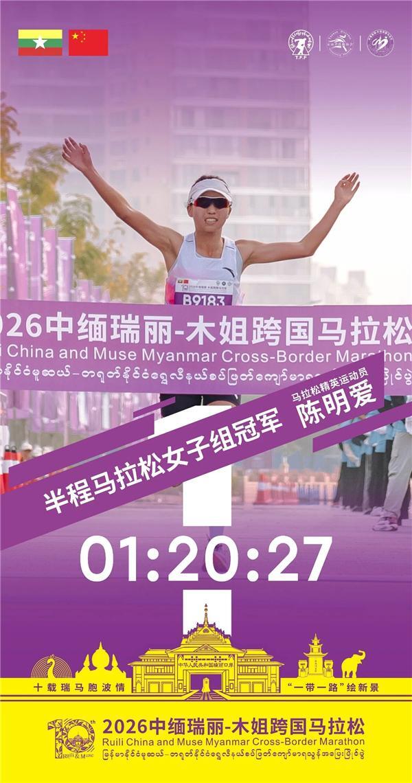 半程马拉松项目中,男子组冠军由选手任鹏获得,成绩为01:07:36;女子组冠军则由选手陈明爱摘得,成绩为01:20:27。