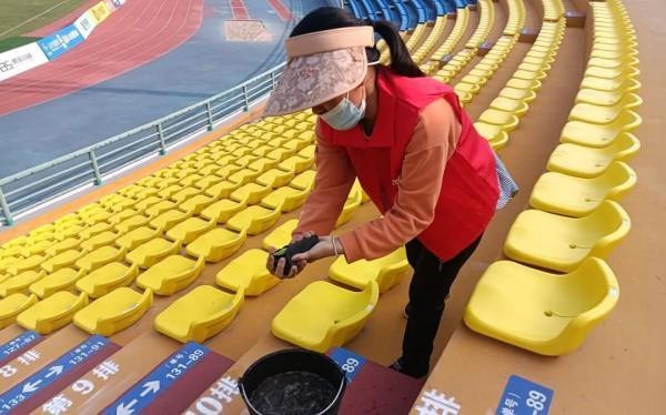 一大早,保洁员普启怡就带着她的清洁工具来到体育场。她的第一项任务,是用抹布逐一擦拭观众席上的座椅。