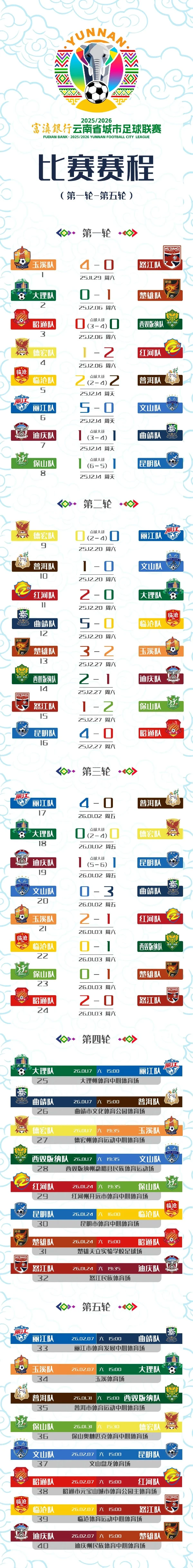 2025/2026富滇银行云南省城市足球联赛赛程(第一轮至第五轮)更新