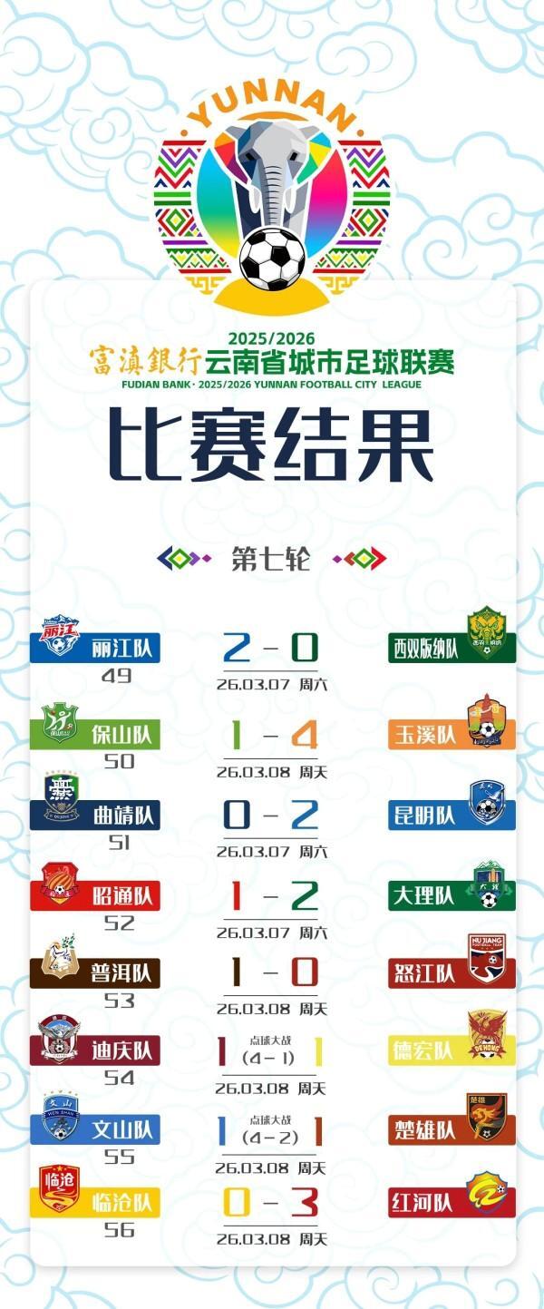 滇超联赛第七轮全部赛事落下帷幕,8场对决精彩纷呈,既有强强对话的激烈博弈,也有逆转翻盘与点球决胜的惊喜,积分榜格局随赛事推进进一步明晰。