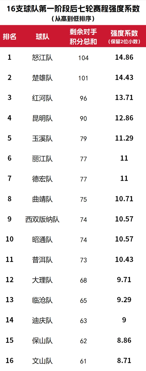 滇超联赛第一阶段后七轮各队赛程难度划分