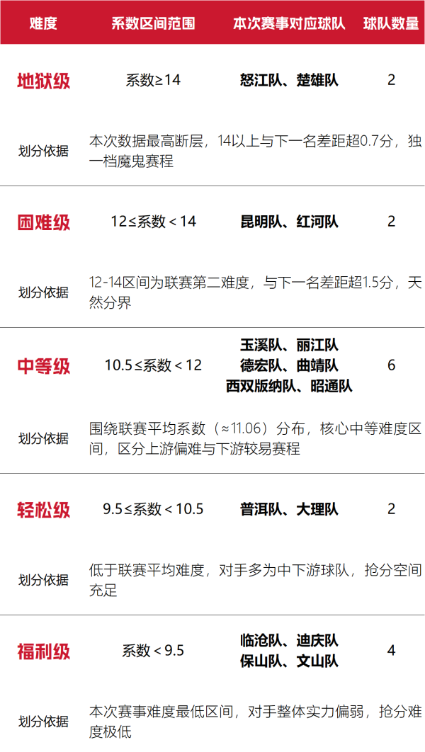 本部分按照滇超联赛当前积分榜排名顺序,结合各队在第一阶段前半程整体表现以及剩余赛程强度系数、主客场分布特点,对各队剩余赛程难度进行分级评定,并对各队后半程走势与抢分前景做出前瞻分析。